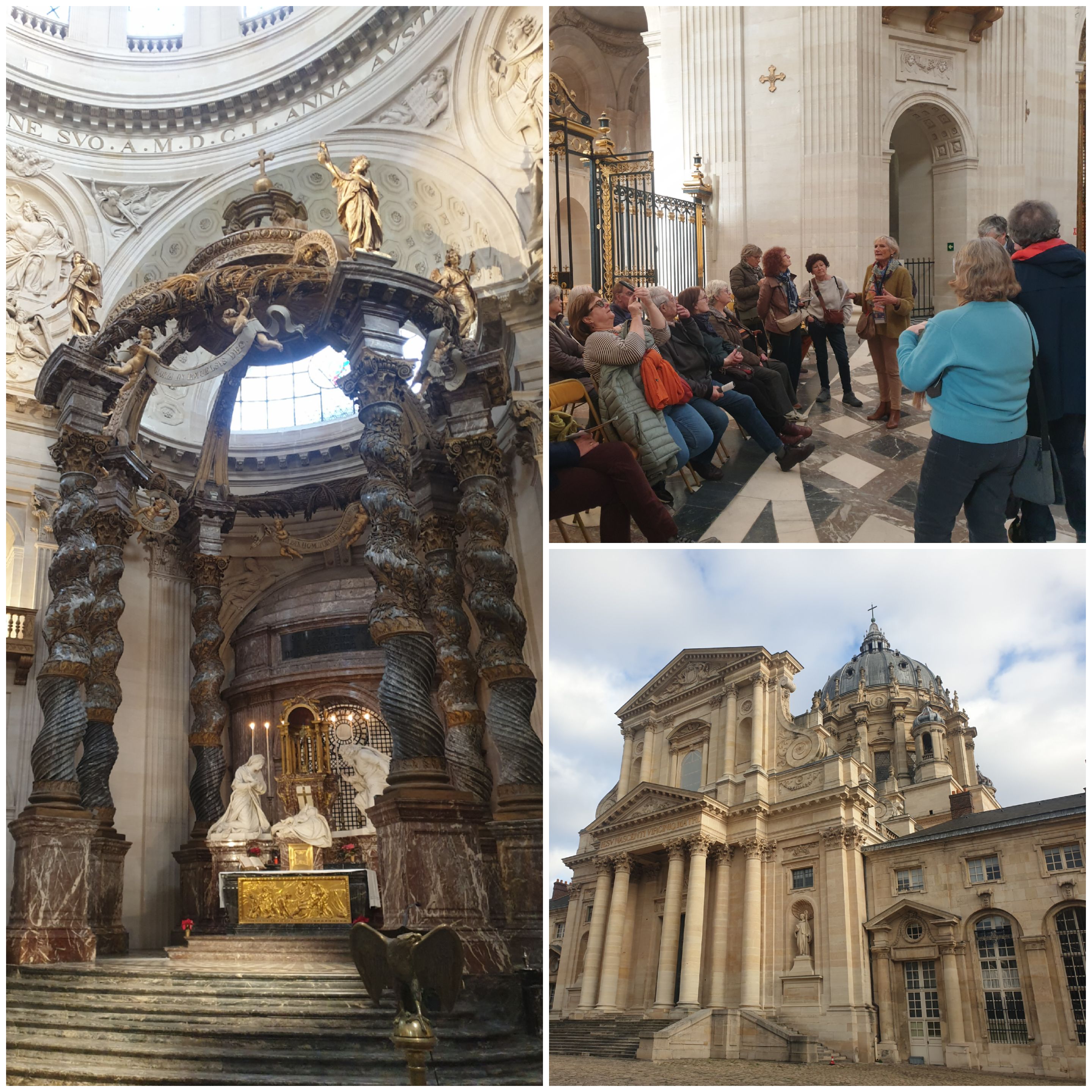RDV devant le Val de Grâce où nous attend notre guide Francine Gaillard. Depuis la cour où trône le buste du Dr Larrey, illustre chirurgien du 17e siècle, elle nous raconte l'histoire d'Anne d'Autriche qui a fait construire cette abbaye en 1645 suite à la naissance du futur roi Louis XIV et dédié à la natalité. A la révolution Française cet édifice devient un hôpital militaire. Il accueillera tous les blessés de guerre et contribuera aux progrès médicaux. C'est ce que nous montre l'exposition au musée du Service de Santé des Armées très documentée par de nombreux tableaux, matériel, costumes... illustrant toutes les innovations des différentes époques évoquées (Nouvelle chirurgie, vaccination, hygiène..)